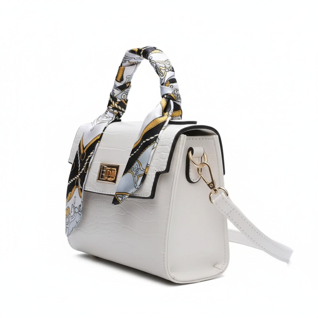 This bag is also adorned with an elegant fabric scarf , which you can tie around the handle for an extra touch of sophistication. Its closure is secured with a metal clasp , adding a touch of shine to the overall design. Furthermore, metal feet at the bottom of the bag protect the base and enhance its stability.