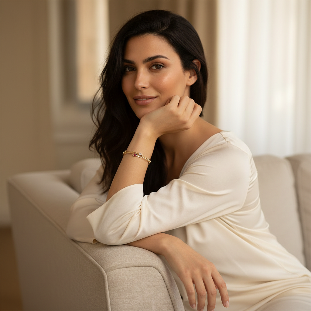 The Elysian Gem Bracelet, a timeless piece designed to captivate. Crafted from durable stainless steel and coated with luxurious PVD gold plating, this bracelet combines elegance and resilience for everyday wear. Adorned with vibrant, multi-colored gemstones, the Elysian Gem Bracelet exudes femininity and grace, making it the perfect accessory to complement any outfit.