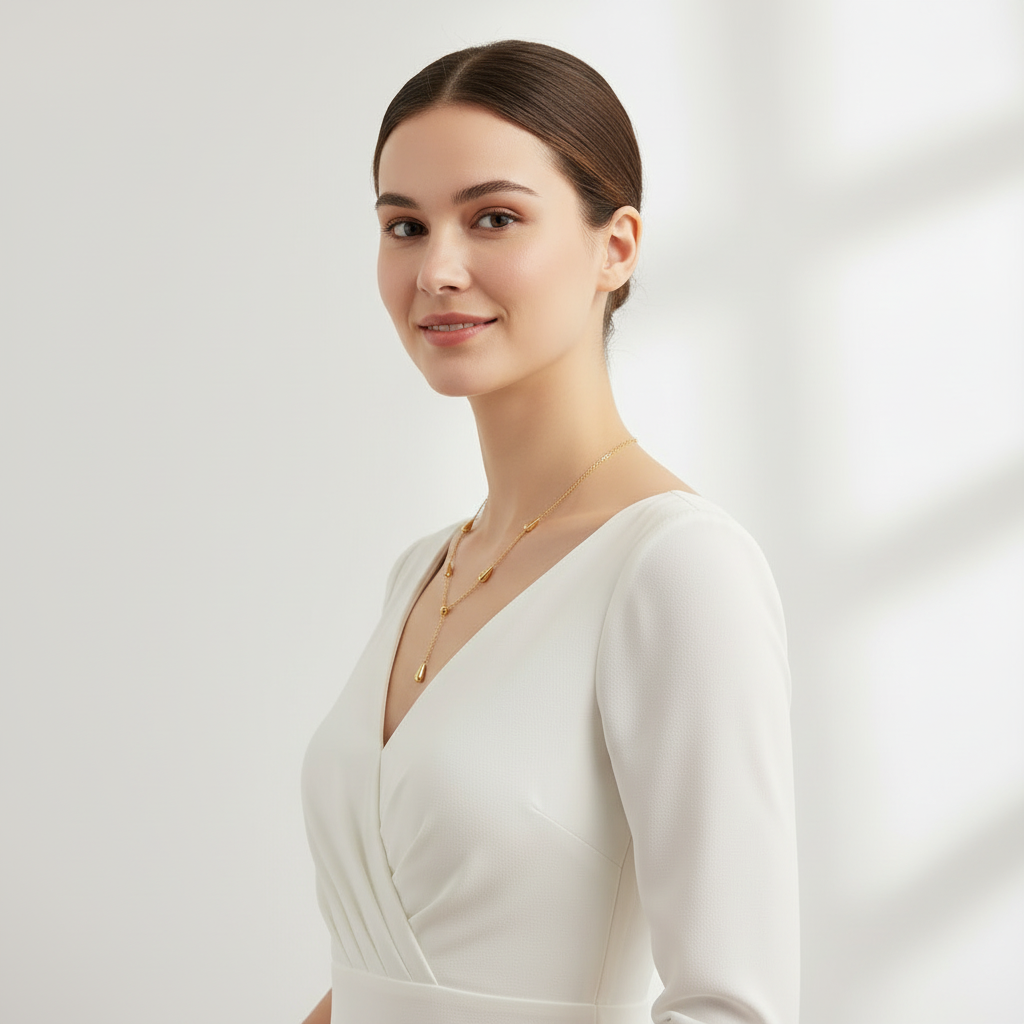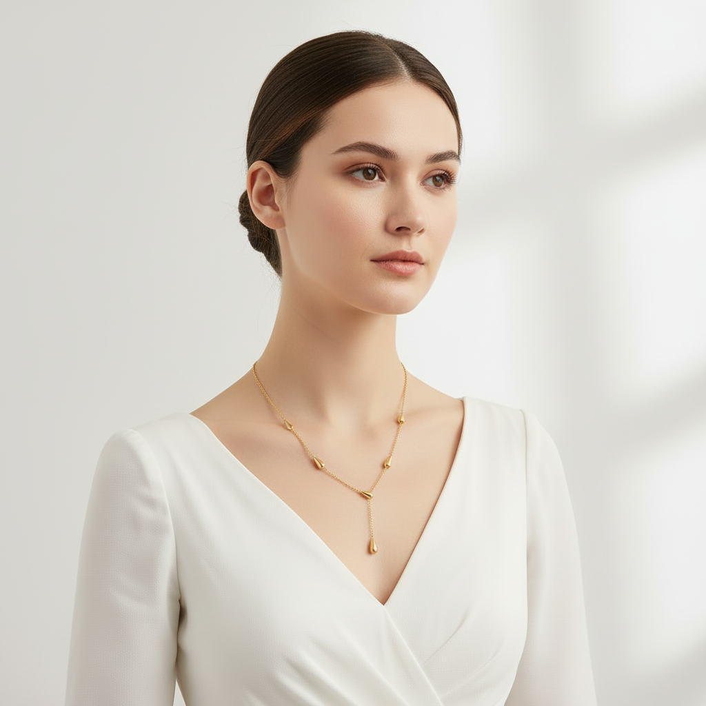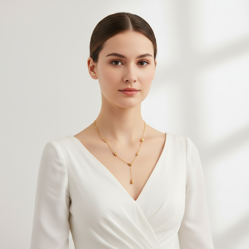 Minimal yet expressive, FLUIDA celebrates femininity in its most refined form. The delicate chain and fluid drops symbolise balance, softness, and continuity — a piece created to move with you, not against you.