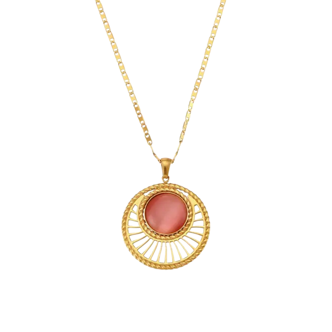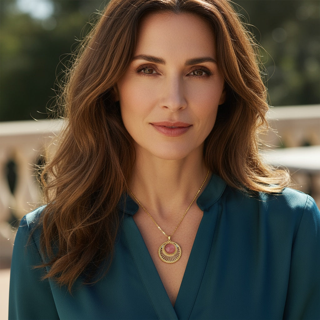 Inspired by the soft blush tones of a Mediterranean sunset, Solaria Rosa embodies romance, warmth, and feminine radiance. Its gentle rose stone reflects twilight skies glowing over calm seas, symbolising love, tenderness, and inner beauty. A bold yet graceful medallion for women who carry warmth in their presence and elegance in every moment.