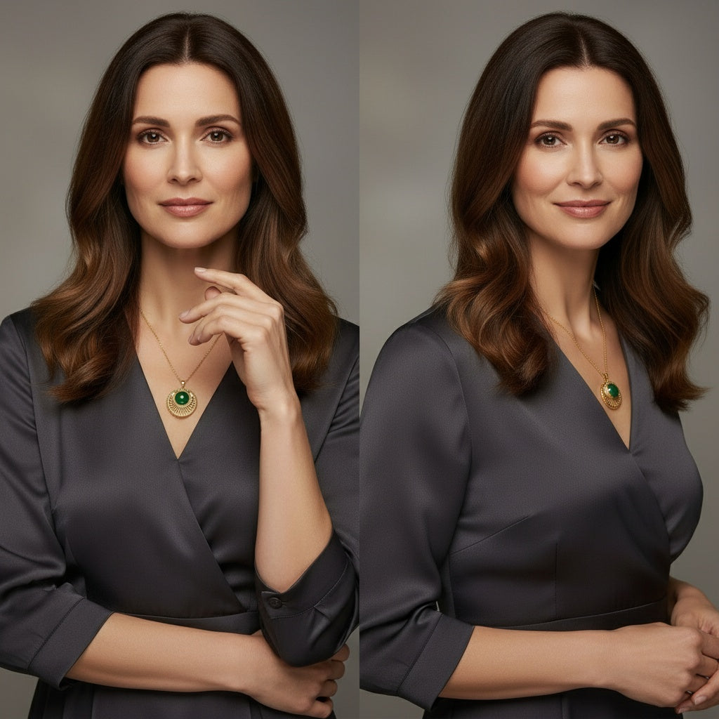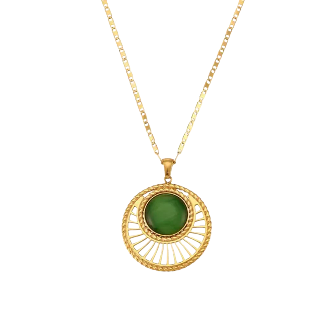Inspired by the deep greens of Mediterranean landscapes, Solaria Verde represents harmony, strength, and natural elegance. Its rich emerald stone reflects the beauty of coastal forests and sparkling island waters, symbolising balance, grounding energy, and renewal. A bold, radiant medallion for women who move with grace, power, and purpose.