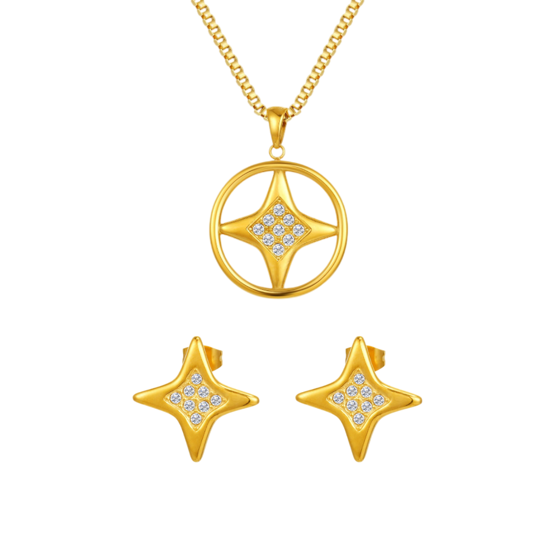 Each piece reflects that golden radiance through a sleek star-shaped design, delicately adorned with sparkling zirconia stones. Crafted from stainless steel and finished with three layers of heavy PVD gold plating, Stella combines lasting brilliance with refined simplicity.