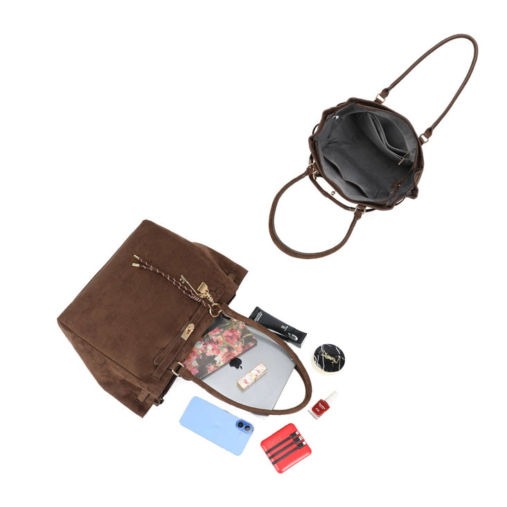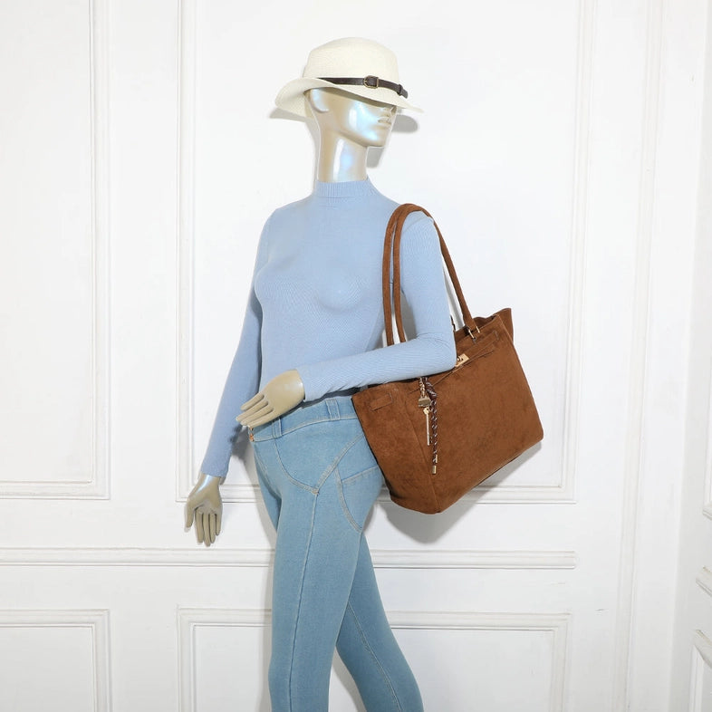 Elegant and practical, the Velina bag charms with its soft-to-the-touch faux suede material and refined design. Its generous size allows for easy storage of documents or a laptop, making it an ideal companion for the office or busy days. The little extra: its decorative keychain with chain and charms, adding a touch of charm to the whole.